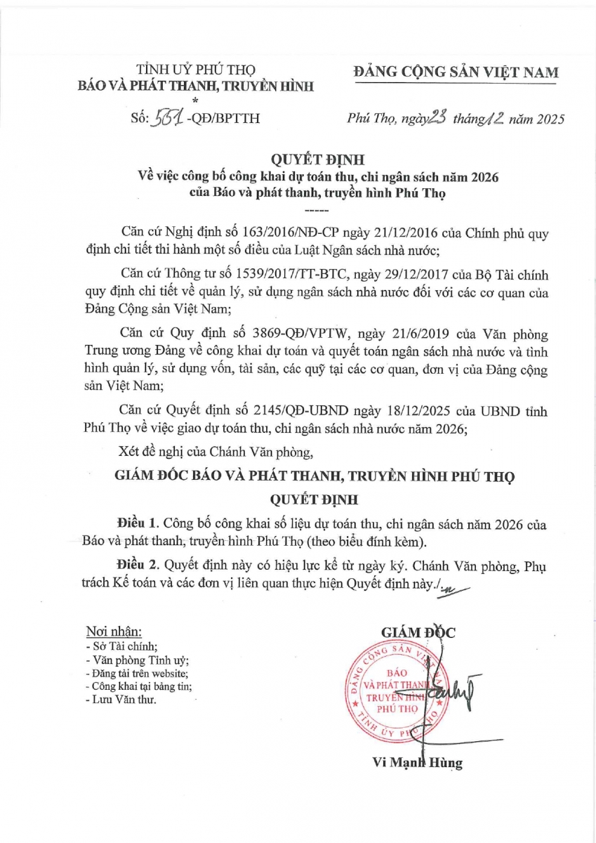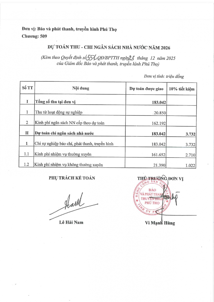 Dự toán thu, chi ngân sách năm 2026 của Báo và phát thanh, truyền hình Phú Thọ