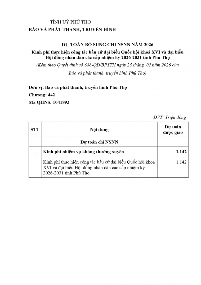 Quyết định về việc công bố công khai dự toán bổ sung chi ngân sách năm 2026 của Báo và Phát thanh, Truyền hình Phú Thọ (Kinh phí thực hiện công tác bầu cử đại biểu Quốc hội khóa XVI và đại biểu Hội đồng nhân dân các cấp nhiệm kỳ 2026-2031 tỉnh Phú Thọ)